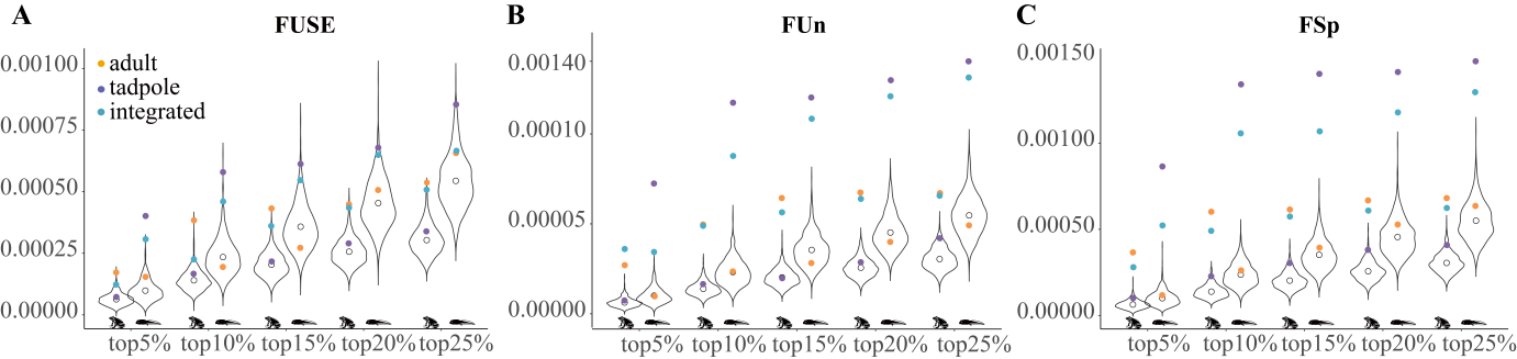 图2.不同优先级物种(前5%-25%)对功能多样性的代表程度。A:基于《中国生物多样性红色名录》确定的功能独特性-特化性-濒危性(FUSE)综合指标;B:功能独特性(FUn);C:功能特化性(FSp)。纵轴表示功能多样性数值。紫色圆点:基于蝌蚪指标识别的优先物种;橙色圆点:基于成体指标识别的优先物种;蓝色圆点:基于综合指标识别的优先物种。小提琴图展示零模型分布,空心圆点表示零模型均值。