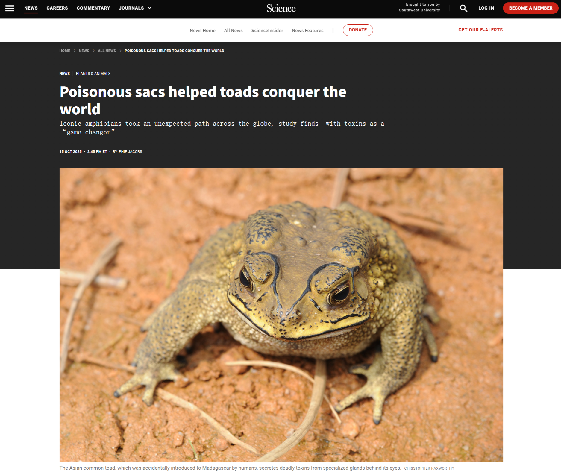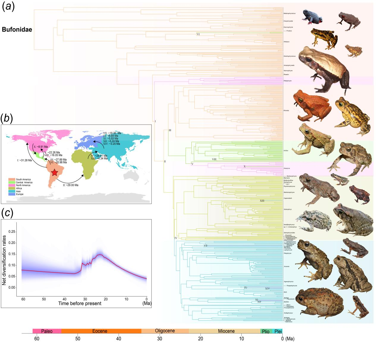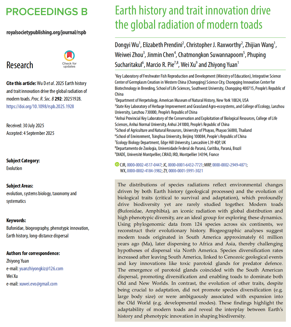 2025年10月15日,开云kaiyun网页版官网袁智勇教授团队联合多国学者在Proceedings of the Royal Society B发表了题为“Earth history and trait innovation drive the global radiation of modern toads”的研究论文。该研究系统揭示了蟾蜍如何在地球历史演化(板块运动、气候变化)与耳后腺(毒腺、防御)和脂肪体(能量、代谢)等关键性状创新的协同作用下,从南美洲起源并实现全球分布,为理解不同大陆间生物的演化过程及其变化规律提供了重要的新视角。该研究获《Science》杂志专题报道(https://www.science.org/content/article/poisonous-sacs-helped-toads-conquer-world)。