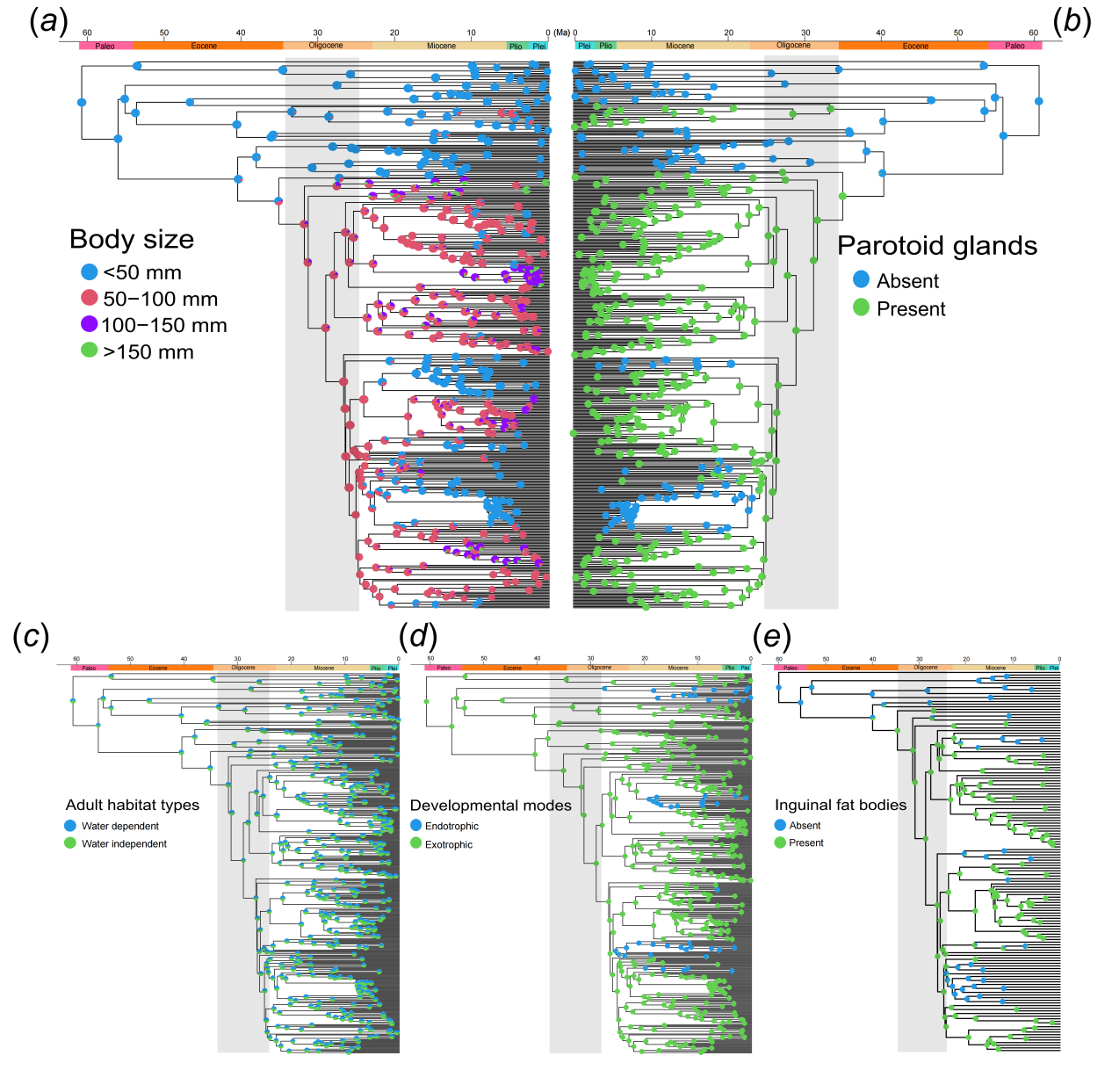 图3 现代蟾蜍的性状祖先状态重建。(a) 体型。(b) 耳后腺。(c) 成体栖息类型。(d) 发育方式。