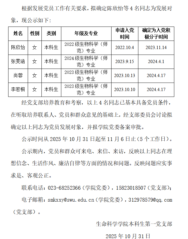 本科生第一党支部发展对象公示(第二批)